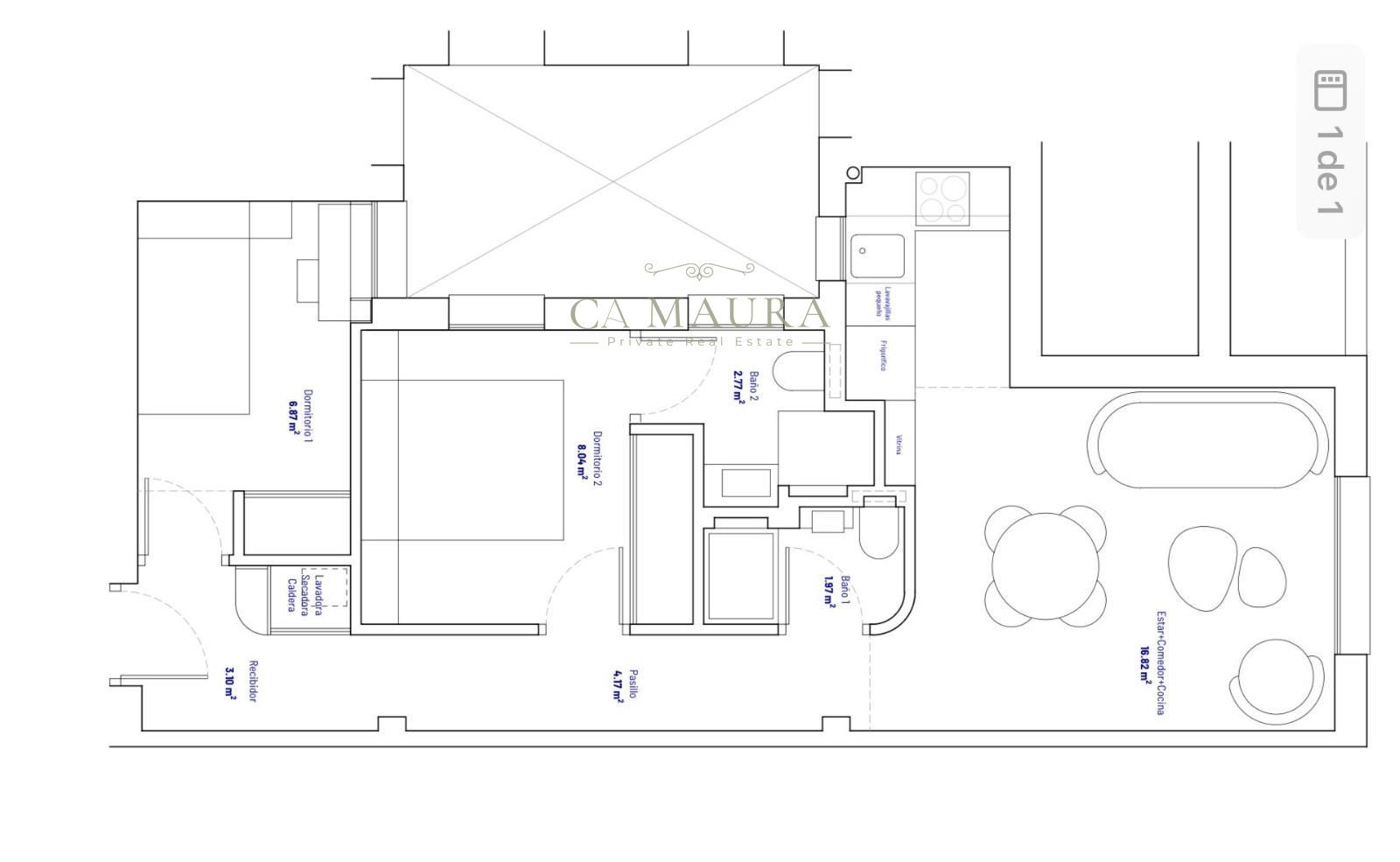La vivienda se articula en torno a una amplia zona social donde salón, comedor y cocina se integran con naturalidad y mantiene una conexión fluida con el espacio principal, creando un ambiente abierto, luminoso y especialmente agradable tanto para el día a día como para recibir invitados. La zona privada cuenta con 2 dormitorios, uno de tamaño doble y otro, sencillo y dos baños completos, uno de ellos en suite. Ambos dormitorios disponen de amplias soluciones de almacenaje cuidadosamente integradas que combinan funcionalidad y estética, optimizando el espacio sin comprometer el diseño.