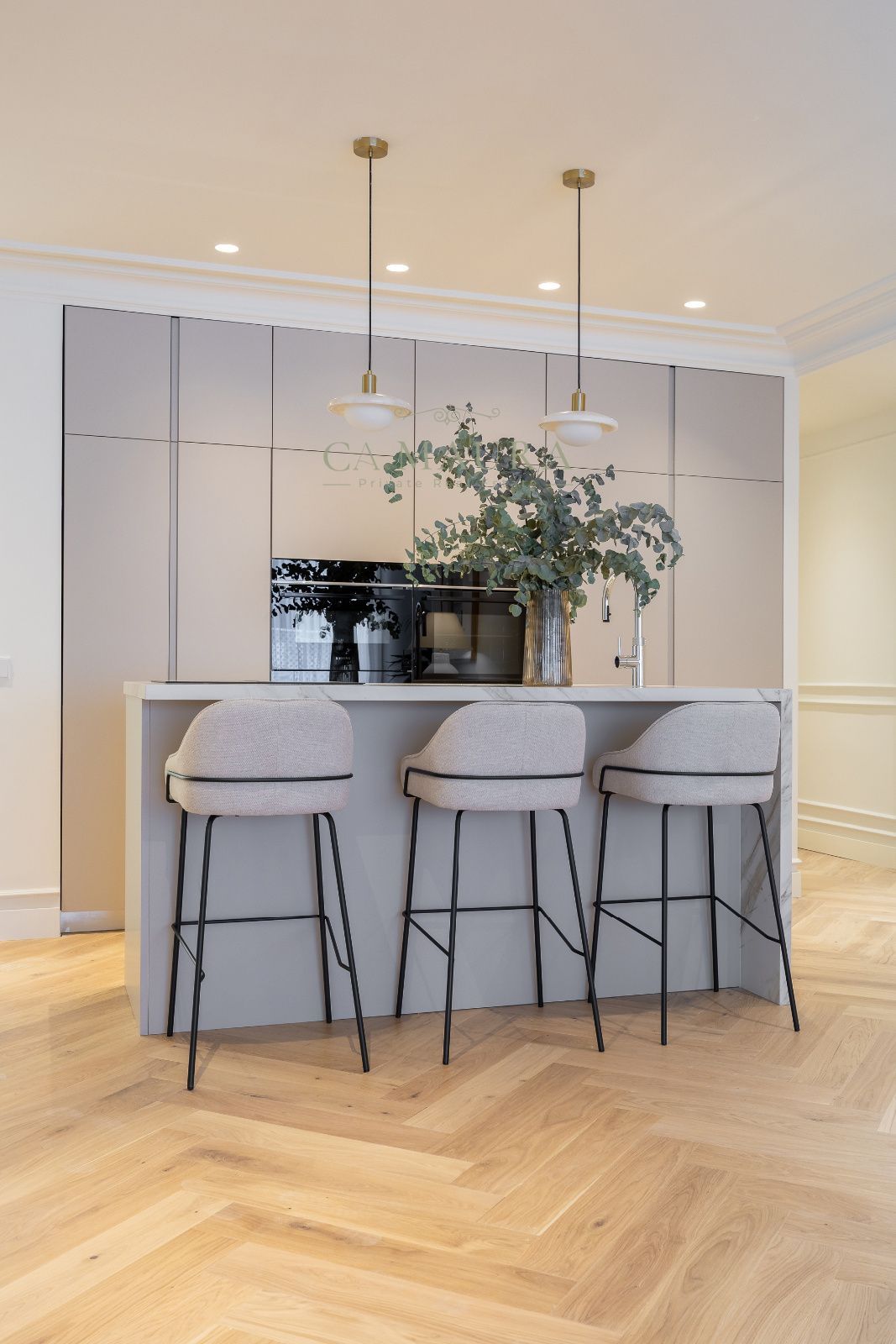 La vivienda destaca por la calidad de sus materiales y una cuidada selección de acabados que aportan elegancia y calidez a los espacios. Los suelos de madera natural y la altura de los techos refuerzan la sensación de amplitud, mientras que las ventanas de altas prestaciones garantizan un excelente aislamiento térmico y acústico. La cocina cuenta con mobiliario a medida y electrodomésticos integrados, combinando diseño y funcionalidad, y los baños presentan una estética contemporánea con materiales seleccionados y acabados de calidad. La vivienda dispone además de aire acondicionado por conductos y calefacción central con contadores, garantizando confort durante todo el año.