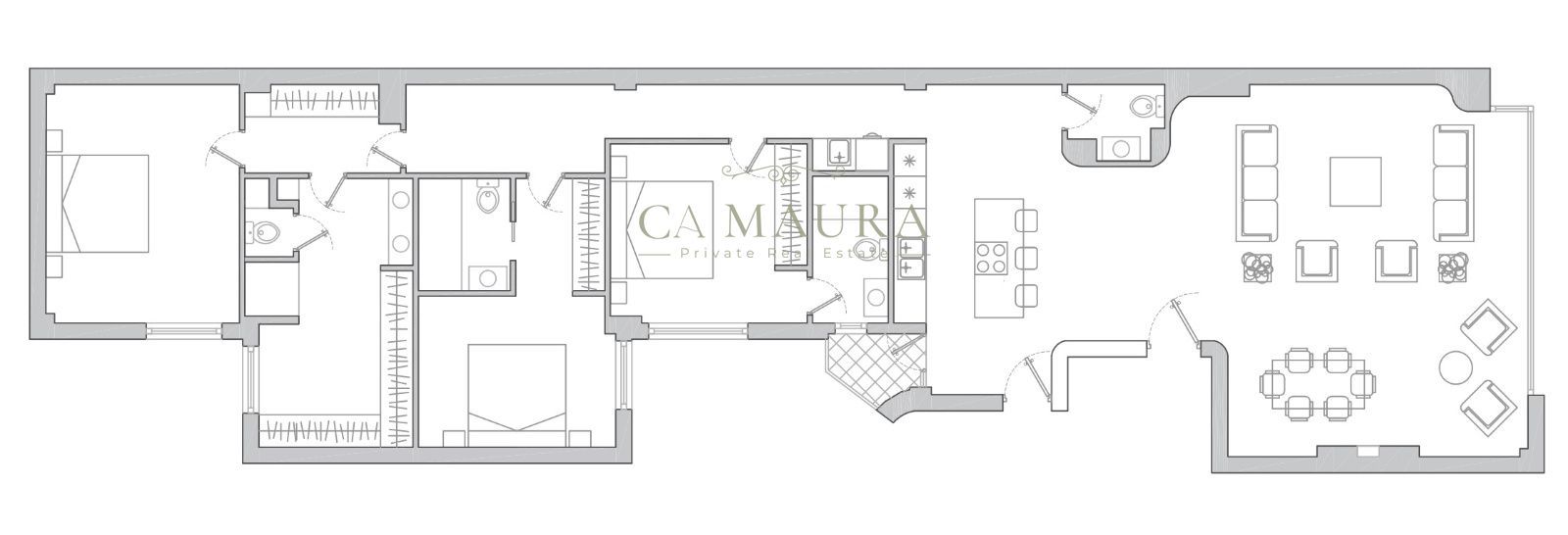 La vivienda se articula en torno a una amplia zona social donde salón, comedor y cocina se integran con naturalidad y mantiene una conexión fluida con el espacio principal, creando un ambiente abierto, luminoso y especialmente agradable tanto para el día a día como para recibir invitados. La zona privada cuenta con 3 dormitorios dobles, todos con baños en suite y aseo de cortesía. Todos los dormitorios disponen de amplias soluciones de almacenaje cuidadosamente integradas que combinan funcionalidad y estética, optimizando el espacio sin comprometer el diseño.