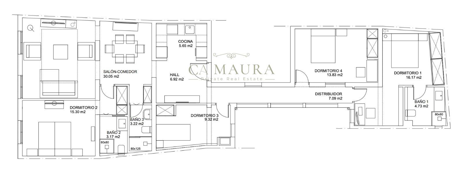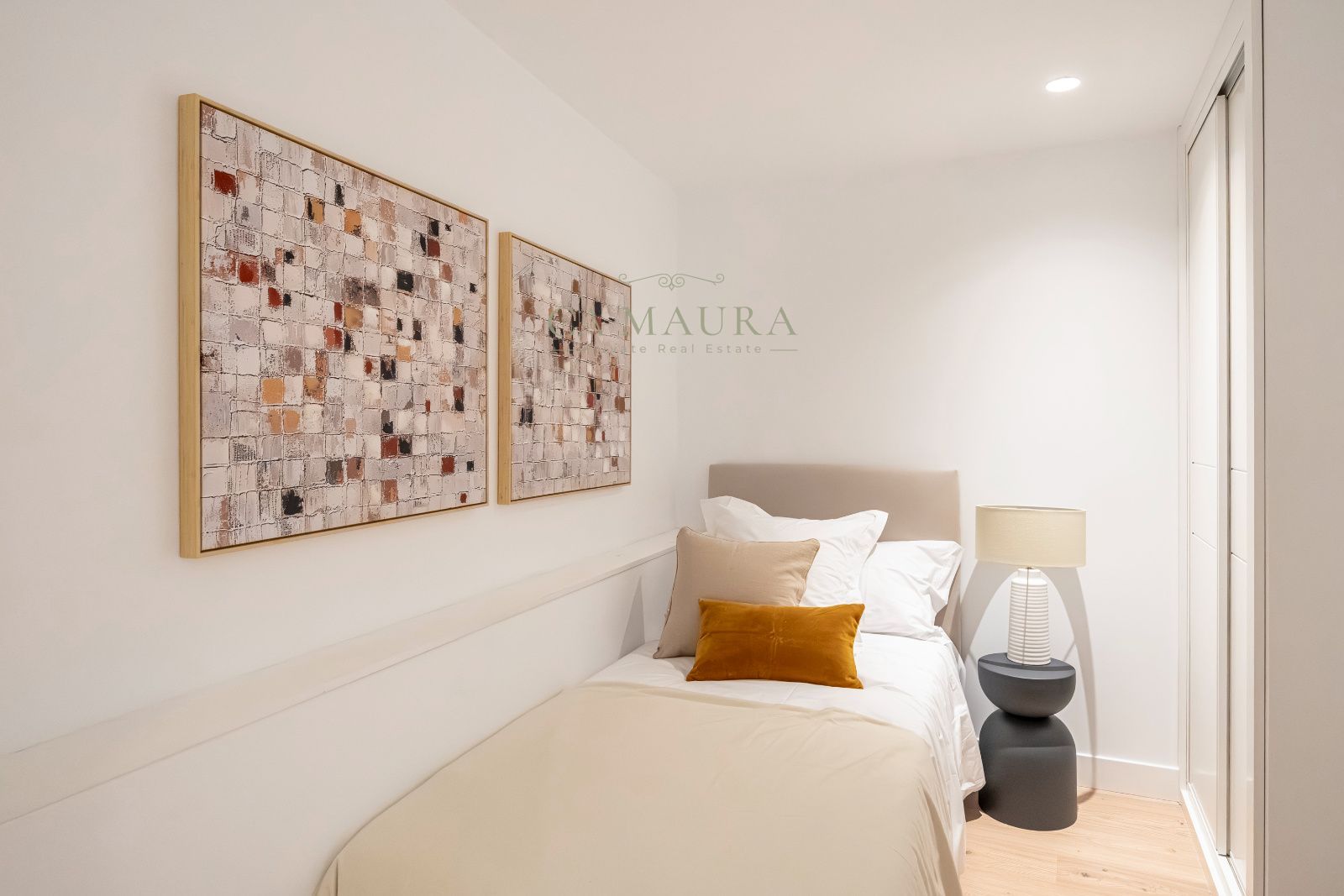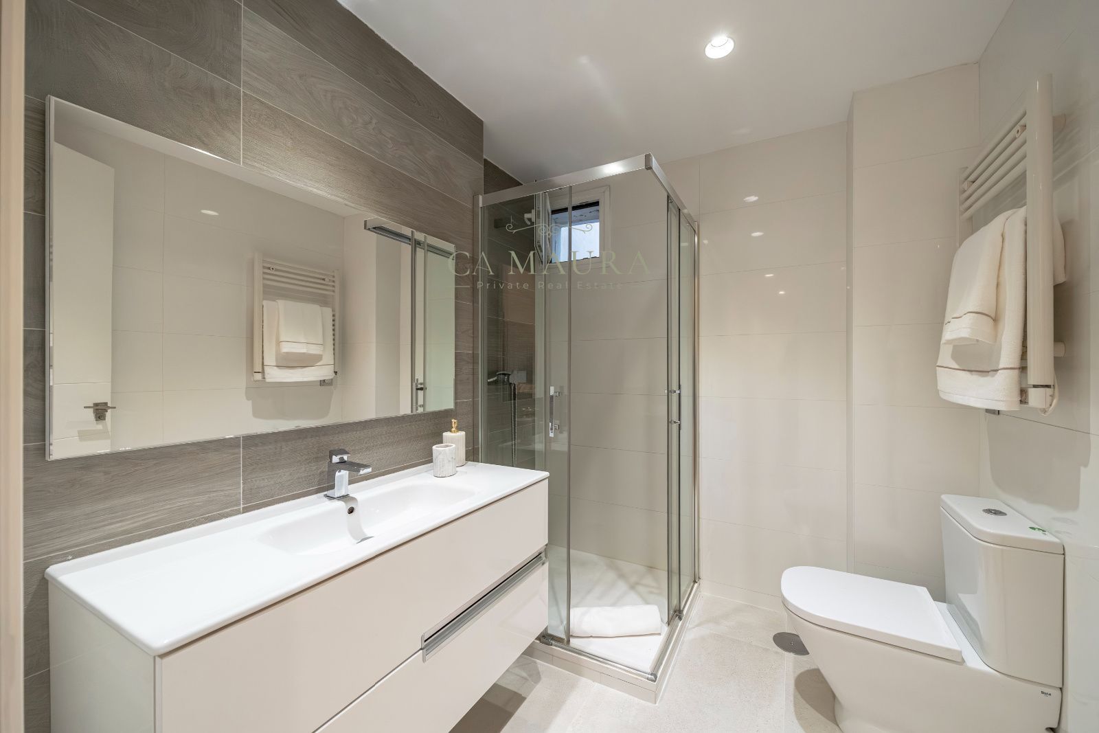 La vivienda se articula en torno a una amplia zona social donde salón y comedor se integran con naturalidad, mientras que la cocina, semi-independiente mantiene una conexión fluida con el espacio principal, creando un ambiente abierto, luminoso y especialmente agradable tanto para el día a día como para recibir invitados. La zona privada cuenta con 3 dormitorios dobles más uno de tamaño individual y 3 baños completos, uno de ellos en suite. Todos los dormitorios disponen de amplias soluciones de almacenaje cuidadosamente integradas que combinan funcionalidad y estética, optimizando el espacio sin comprometer el diseño.